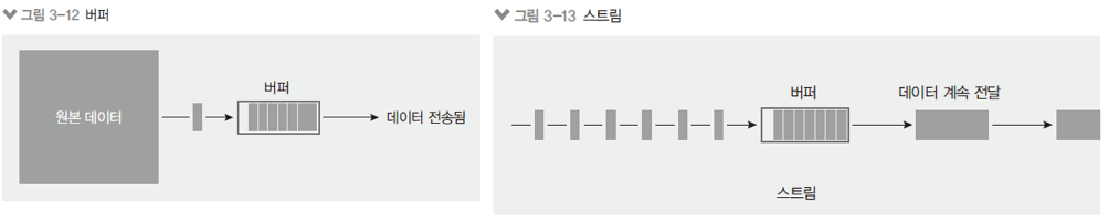 const buffer = Buffer.from('text'); console.log(buffer) console.log(buffer.toString());단점 : 모든 내용을 버퍼에 다 쓴 후에야 다음 동작으로 넘어가므로 거의 전체 용량을 버퍼로 처리해야 다음 단계로 넘어갈 수 있었다.