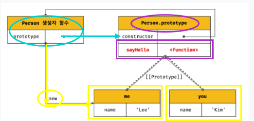 function Person(name){ this.name = name; } Person.prototype.sayHello = function(){ console.log(`Hi! My name is ${this.name}`); } const me = new Person('Kim'); const you = new Person('Lee'); me.sayHello(); you.sayHello();