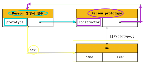 생성자 함수에 의하여 생성된 객체(me) 의 프로토타입은 Person.prototype이다.